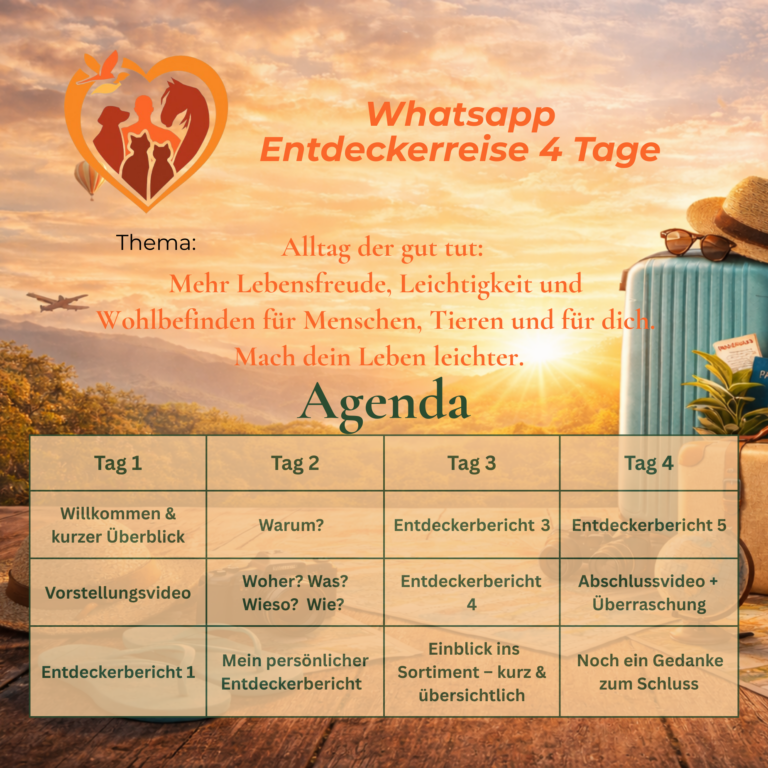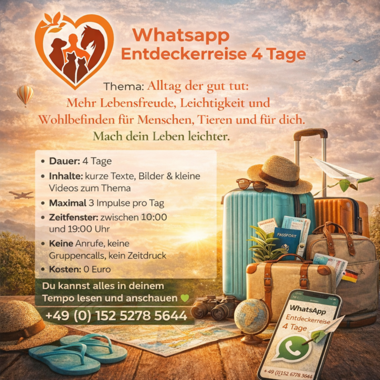 4 Tage lang teile ich in einer eigens angelegten Whatsapp-Gruppe Einblicke & ausgewählte Erfahrungsberichte von Menschen und Tierhalter:innen 💧 für mehr Lebensfreude, Leichtigkeit und Wohlbefinden im Alltag.